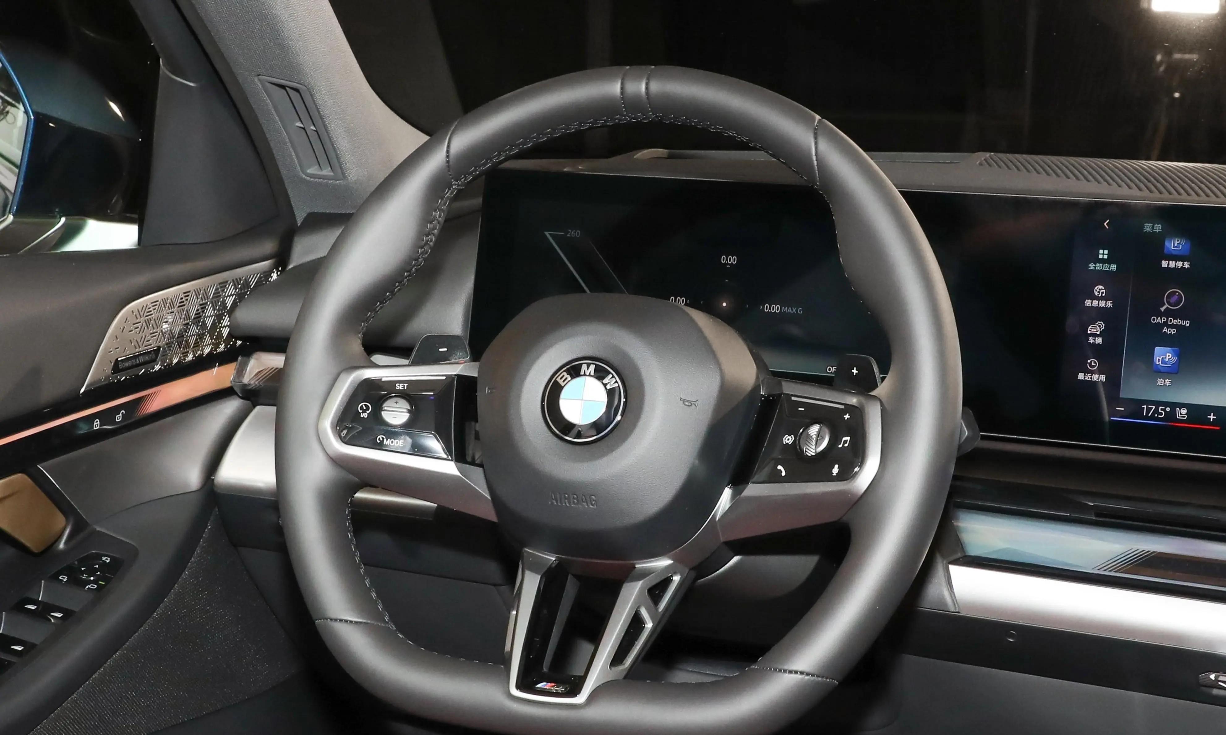 新款宝马5系将采用宝马近年来推广的一体式悬浮曲面屏,并搭载iDrive8.5车机系统。实体空调控制区域的按键被大幅缩减,改为触控操作,并保留功能岛区域的实体按键和旋钮。方向盘也从传统的圆形改为平底式,整体设计更接近最新发布的全新一代宝马7系。