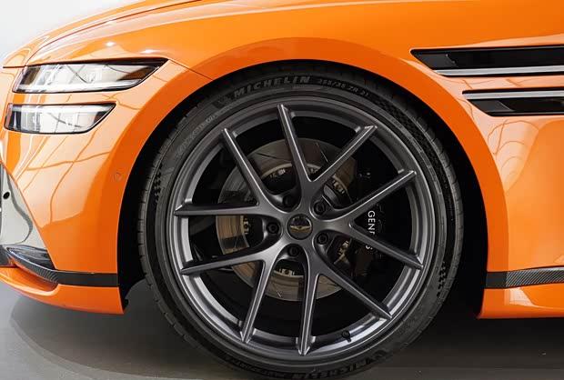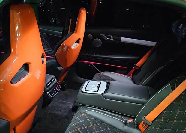 从车身侧后方望去,G80 Magma Special的造型尤为引人注目。宽体设计的前后翼子板配合21英寸双五辐轻量化轮圈,加上醒目的橙色车漆与黑色外后视镜、装饰条等细节,勾勒出中大型轿车修长而动感的线条。车尾部分,碳纤维扰流板、扩散器以及双边双出排气布局突出了性能取向,反弓式的尾部轮廓则流露出几分纳斯卡赛车的设计韵味。