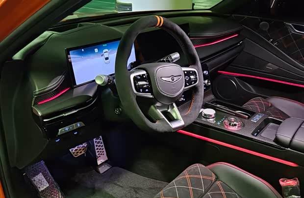 进入车内,Magma专属元素随处可见:方向盘上设有橙色回正环,座椅采用白橙交织的菱形条纹缝线,细节之处点缀巧妙。车内大量运用Alcantara面料,配备带有橙色背板的Recaro高性能运动座椅,中控等区域则覆盖碳纤维饰板,在豪华氛围中融入了浓厚的运动风格。