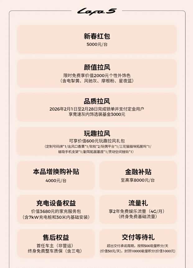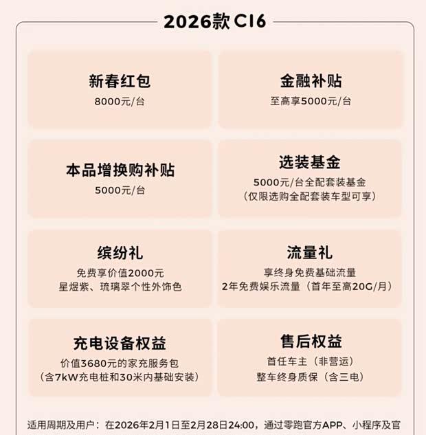 具体车型优惠如下:Lafa5与B10车型提供5000元现金红包、4000元本品增换购补贴,金融补贴最高可达8000元。B01车型享有3000元红包、8000元金融补贴及4000元本品增换购补贴。C11车型可获6000元红包、5000元金融补贴与5000元本品增换购补贴。2016款C16车型提供8000元红包、5000元金融补贴及5000元本品增换购补贴。C10车型享有4000元红包、5000元金融补贴和4000元本品增换购补贴。T03车型可享受9500元红包,金融补贴最高为2000元。C01车型的红包金额达到1.7万元,金融补贴最高为5000元。