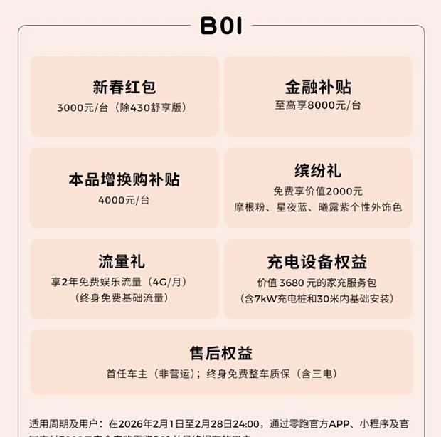 近日,零跑汽车公布了2月购车优惠方案,为消费者提供多项购车权益。活动期间,购车者可享受新年1.1万元现金优惠,最高可获得1万能量积分,并有机会申请长达5年的免息贷款。部分优惠活动将持续至2月28日。