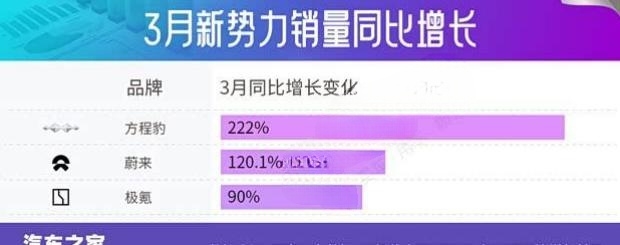 理想汽车同样表现强势,3月销量达41053台,重新回到第一阵营。官方透露,i6产能逐步释放是销量增长的关键因素,该车型3月销量已突破2.4万台。年内理想还将推出多款全新车型,持续提升产品竞争力。在同比增速方面,方程豹以222%的增幅领先,3月销量为25926台,钛7仍是主要贡献车型;其纯电版本计划于4月上市,有望推动销量进一步攀升,品牌首款轿车也预计在年内推出。蔚来、极氪等品牌同样实现较高增长,家庭三排SUV成为销量主力,后续将分别推出ES9与8X等车型,继续深耕家用SUV市场。此外,备受关注的小米汽车3月销量超过2万台,新款SU7上市后已实现7000台交付,市场热度持续。