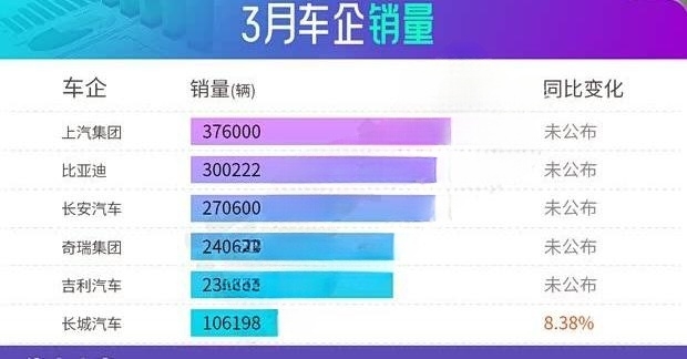 从车企集团层面看,销量同样实现显著增长,相比2月多数企业迎来跨越式提升。上汽集团以37.6万台销量继续领跑行业,比亚迪官方表示其获得中国车企乘用车销量冠军。海外市场已成为各大集团的核心增长引擎:上汽一季度海外销量为32.5万台;比亚迪一季度海外销量达319751台,3月单月为119591台;长安汽车3月海外销量为103900台;奇瑞一季度海外销量达393311台,3月为148777台;吉利一季度海外销量为203024台,3月为81639台。各企业在海外市场均交出了亮眼成绩单。