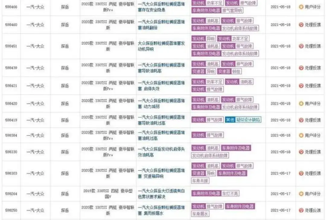 早在2021年,大众探岳就爆发过大面积的颗粒物捕捉器堵塞故障,不少探岳330TSI车型的车主投诉称自己的车辆出现了颗粒物捕捉器堵塞的情况,导致车辆加速无力、油耗升高,最高的时候甚至达到了40L/100km。车主们去4S店维修,对方给出的解决方案要么是让车主跑高速,要么是原地踩油门高温燃烧颗粒物捕捉器,让其再生。但这些方法都治标不治本,用不了多久就会再次出现堵塞的情况。