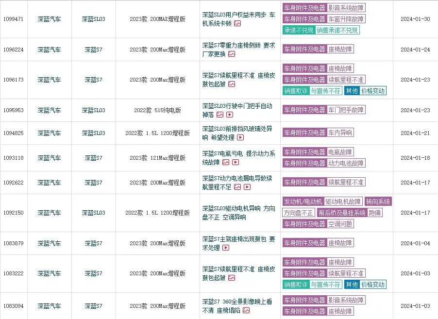 此外,像电机异响、车内异响、充电异响、座椅鼓包、幽灵刹车、续航里程不准等问题也有不少投诉。一位2023款200MAX增程版深蓝S7车主投诉称,在市区路况下“不开空调和不听音乐,实际续航里程也只有标称的6折以内”。其实深蓝汽车质量问题由来已久,早在2022年11月,就有40位深蓝SL03车主联合投诉,称车内摄像头等多处存在电流噪音,屡次维修也无法消除。
