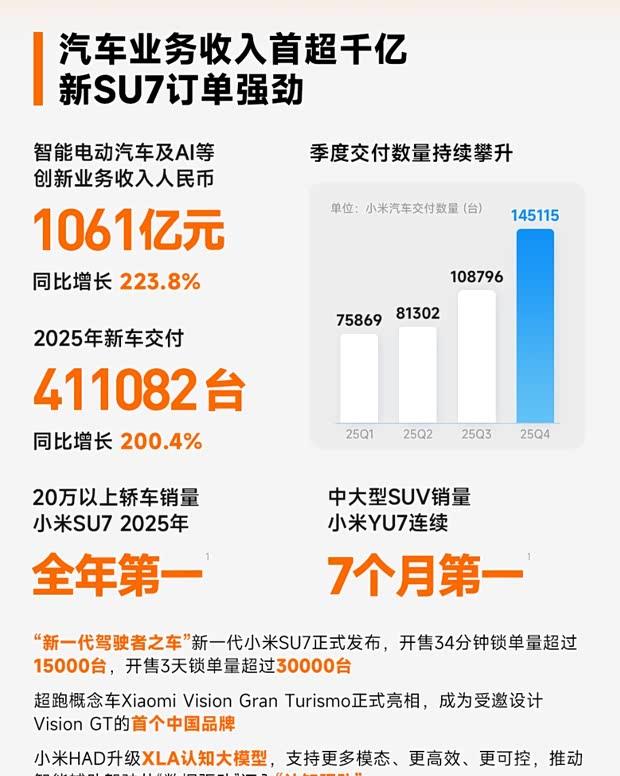 在汽车业务方面,小米全年累计交付新车411082台。旗下车型市场表现强劲:小米SU7在国内20万元以上轿车市场中销量位居首位;另一款车型小米YU7则已连续七个月占据国内中大型SUV销量榜首。此外,新款SU7上市后市场反响热烈,开启销售34分钟内订单锁定即突破15000台,三天内锁单量超过30000台。