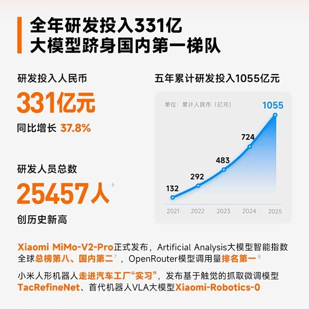 集团在研发领域的持续投入也成为关注焦点。2025年全年研发开支共计331亿元,研发团队规模扩展至25457人。过去五年间,小米累计研发投入已超过千亿元。在人工智能领域,其自研的Xiaomi MiMo大模型目前已进入国内领先梯队,公司计划未来三年内在该领域追加投入600亿元。