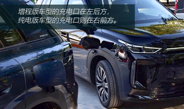 外观方面,AION i60采用了全新的造型语言。尽管该车基于AION V 霸王龙改款而来,但外观风格焕然一新。通过运用锋锐的线条设计和加长的车身尺寸,整车呈现出更为沉稳的视觉感受。充电口位置成为区分两种动力版本的重要特征:纯电版位于右前方,增程版则设计在左后方。此外,车身侧面标识也各不相同,增程版标注“REEV”,纯电版则为“EV”。