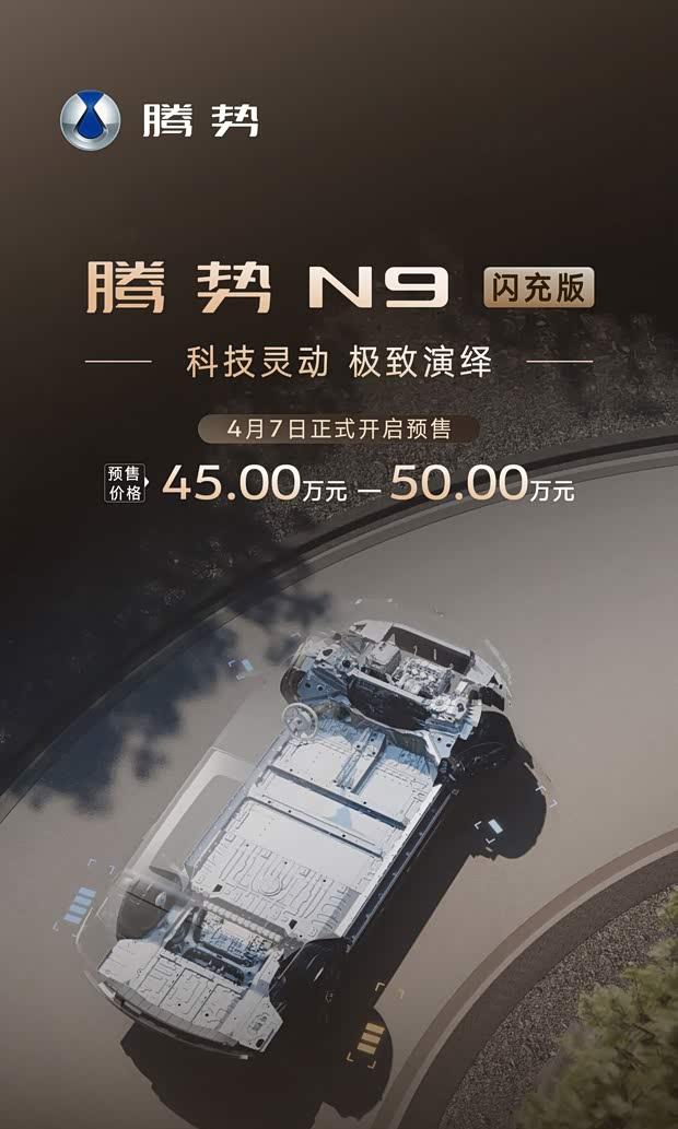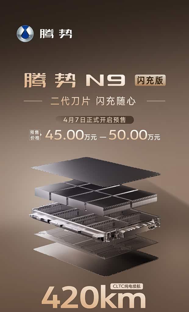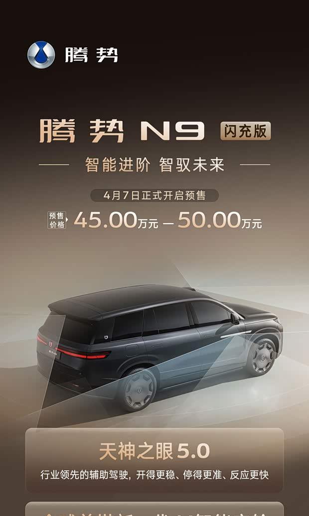 腾势品牌旗下大型SUV新车型——腾势N9闪充版于4月7日正式启动预售,价格区间为45万至50万元。新车在核心配置上进行了重要升级,搭载第二代刀片电池,并配备了新一代AI智能座舱系统。