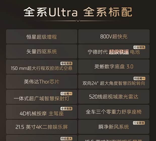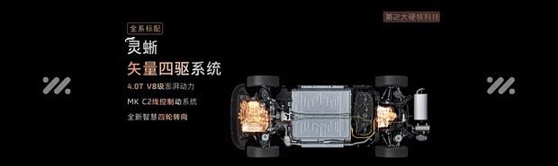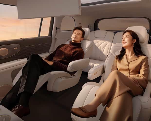 内饰配置方面,新车采用2+2+2六座布局,车身尺寸5279/2000/1806毫米,轴距3160毫米。配备三张零重力按摩座椅、B&O品牌25扬声器音响系统,以及由27.1英寸5K双联屏、15.6英寸3K副驾屏和21.5英寸4K后排娱乐屏组成的多屏系统。安全配置包含笼式车身结构、主动防侧翻3.0系统及AEB自动紧急制动功能。