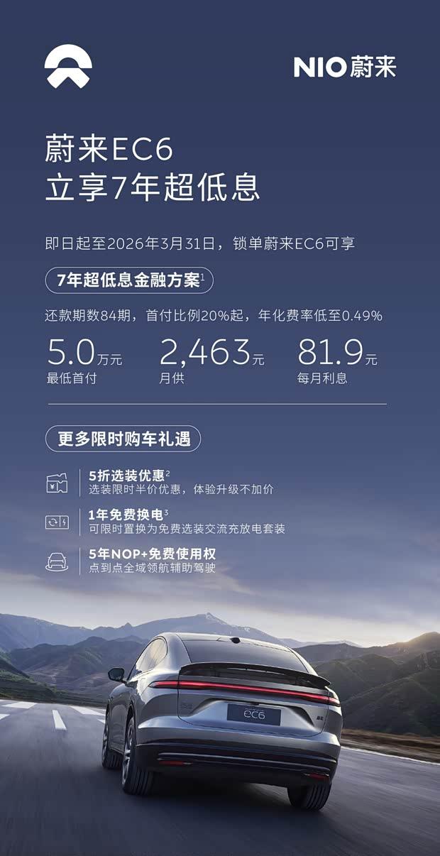 蔚来汽车近日发布三月限时金融购车方案,为旗下多款车型提供灵活购车选择。根据官方信息,即日起至3月31日期间,消费者订购蔚来ET5、ET5T、ES6及EC6车型并完成锁单,即可申请最长7年84期的分期方案,首付比例最低20%起,对应年化费率低至0.49%。