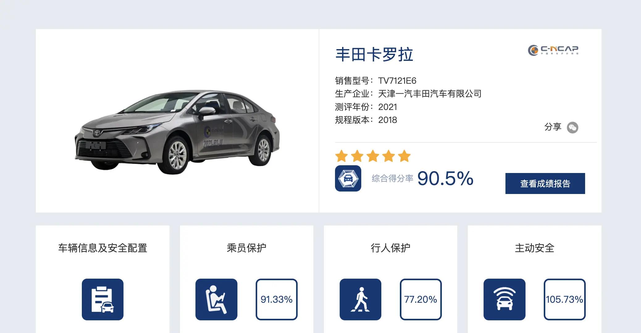 如果将视野扩大到整个主动安全大项,有一些车型的得分更高。比如比亚迪汉EV的得分率达到了100%,一汽丰田卡罗拉的主动安全成绩甚至达到了105.73%。