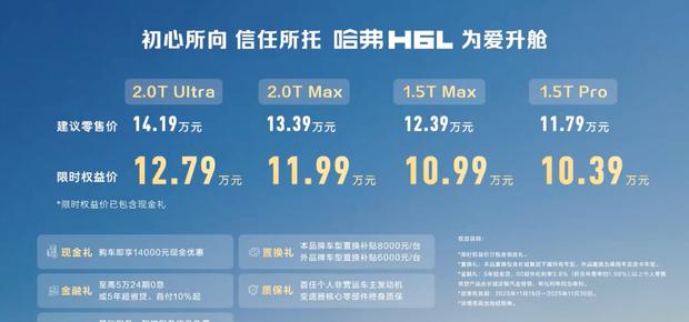 11月18日,哈弗品牌推出全新中型SUV车型——哈弗H6L,共发布四款配置版本,官方指导价区间为11.79万元至14.19万元,同时推出限时购车权益价10.39万元至12.79万元。该车型延续了品牌经典设计语言,搭载Coffee OS 3智能座舱系统,提供1.5T与2.0T两种动力选择,其中2.0T版本匹配9DCT变速箱。新车将与哈弗大狗PLUS形成产品组合,共同强化品牌在燃油中型SUV细分市场的布局。