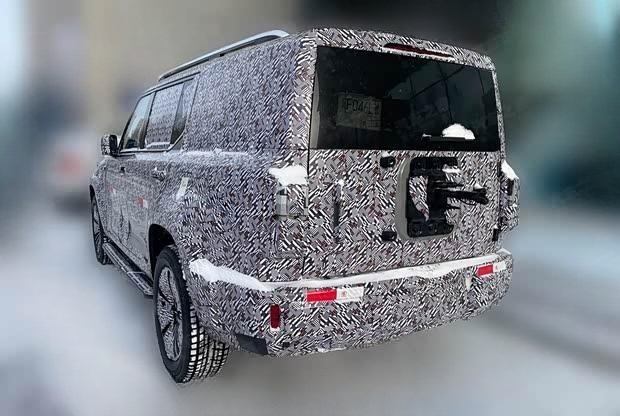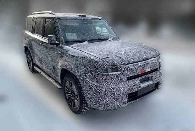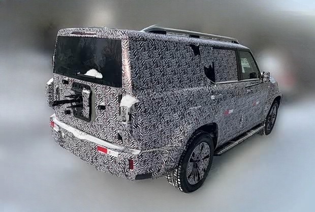 车身侧面轮廓魁梧,采用了固定式侧踏板和传统门把手设计。根据其体量推测,新车长度预计将超过5米,宽度则在2米左右。车尾部分同样延续了硬派风格,尾门中央预留了外挂备胎的安装接口,结合门把手位置判断,预计将采用侧开式尾门设计。