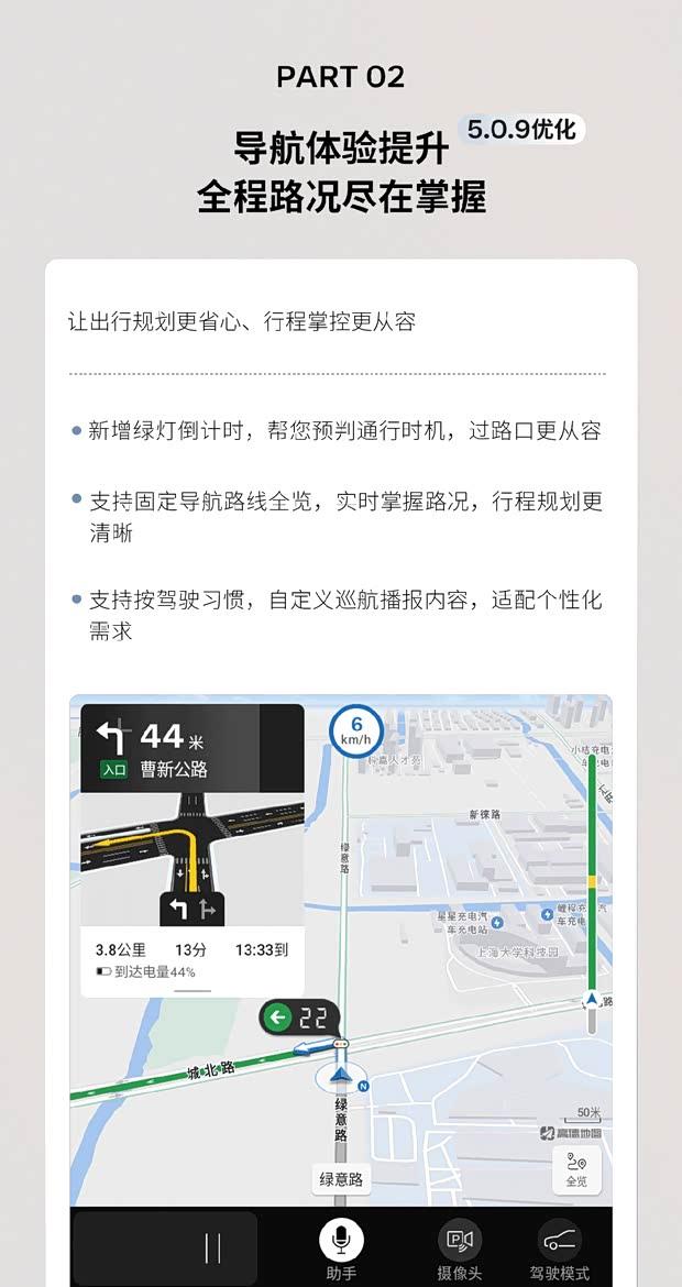 导航系统在此次升级中获得了显著增强。新加入的绿灯倒计时提示,有助于驾驶者更好地判断通过路口的时间。同时,系统支持全程预览固定导航路线,让用户对整体路况和行程规划一目了然。此外,导航的巡航播报内容现在支持自定义,能够更贴合不同驾驶者的个人习惯。