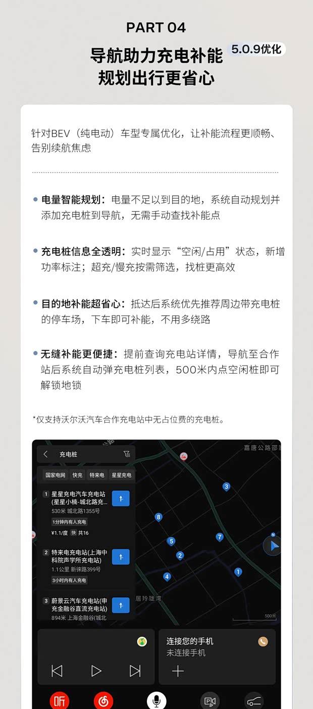 针对纯电动车型,新版软件特别优化了充电导航体验。当系统监测到剩余电量不足以抵达目的地时,会自动在导航路线中添加合适的充电站,无需用户手动搜索。充电桩列表会实时显示空闲状态、功率信息,并支持按快充或慢充进行筛选,找桩效率更高。抵达目的地后,系统会优先推荐附近配备充电设施的停车场。在部分合作的充电站,导航至站点后系统会自动弹出可用充电桩列表,用户可在500米范围内直接选择空闲桩位并解锁地锁。
