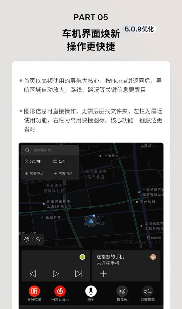 车机主界面在此次更新后也经过了重新设计,布局更加直观。首页以导航信息为核心,当用户通过Home键返回时,导航区域会自动放大,使路线、实时路况等关键信息更加突出。界面上的图形化信息支持直接操作,简化了菜单层级。屏幕左侧显示最近使用的功能,右侧则为常用快捷图标,让用户能够更快速地访问核心功能。