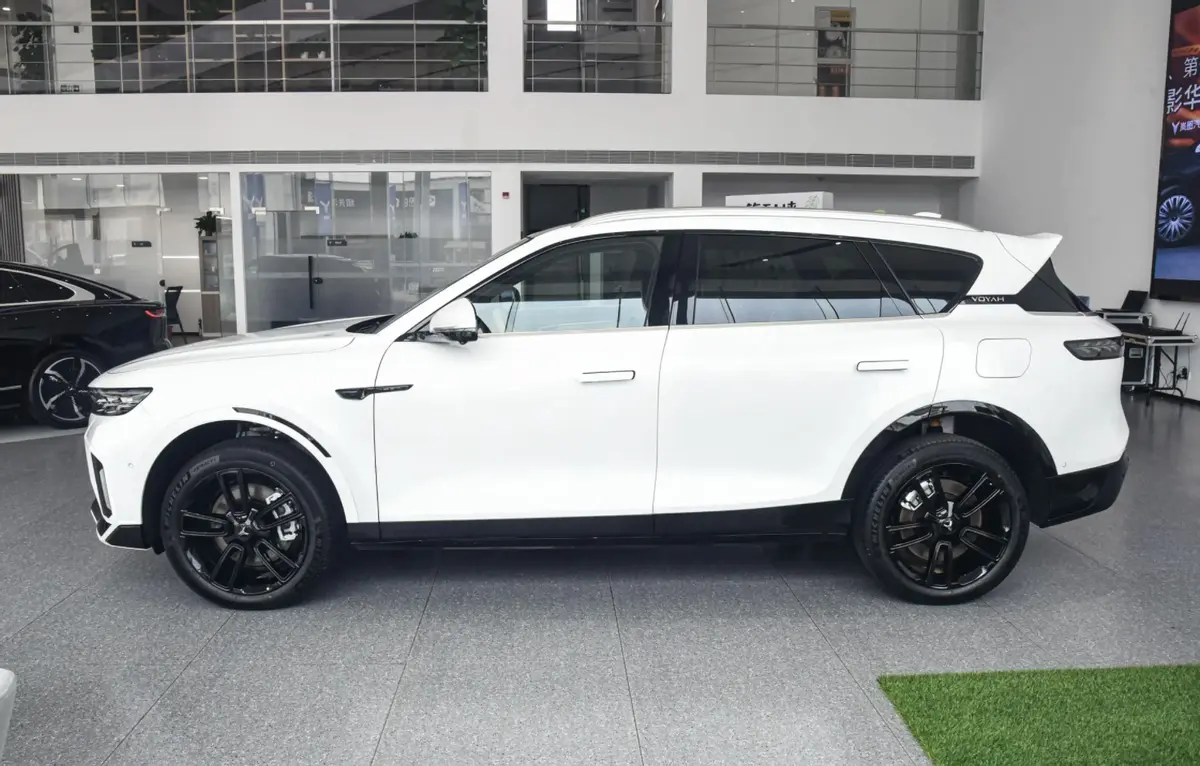 作为一台大5座车型,尺寸是我们关注的目标之一,车辆长宽高在4905×1950×1645毫米,车身轴距在2960毫米,放在展厅中都显得很高大。而且底部轮毂挺霸气,尺寸方面达到20英寸,造型上是星环五辐式设计,并且进行黑化涂装。侧面提供隐藏式门把手,前后车门都可以无钥匙进入,车窗是前排多层隔音玻璃,后排是隐私玻璃。