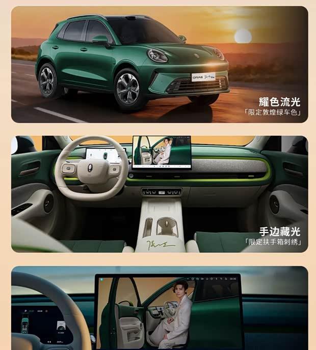 限定版车型在外观与内饰方面融入多项专属设计元素。其采用独特的敦煌绿色车漆,搭配同色轮圈装饰盖及定制签名尾标。车内配备限定刺绣扶手箱、侯明昊主题壁纸与语音包、专属钥匙套以及“猕猴桃”图案脚垫,进一步强化了该版本的特别身份。
