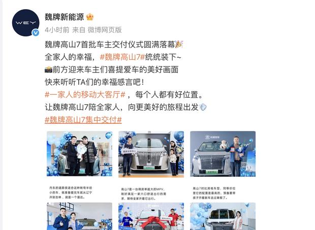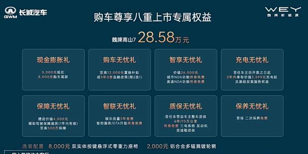 魏牌新能源旗下全新MPV车型高山7于10月19日正式启动用户交付。此次推出的车型定位为家庭七座MPV,官方指导价28.58万元,全系标配长城第三代智能驾驶系统Coffee Pilot Ultra与128线激光雷达,动力系统搭载Hi4智能四驱电混技术。