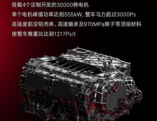 动力系统采用全域1200V超高压平台,配备四电机系统,总功率达到2220千瓦,推重比高达1217马力/吨。新车还搭载了全新的赛道级刀片电池,通过优化电芯设计和降低内阻,配合双层冷却结构,实现了30C的超高放电倍率。