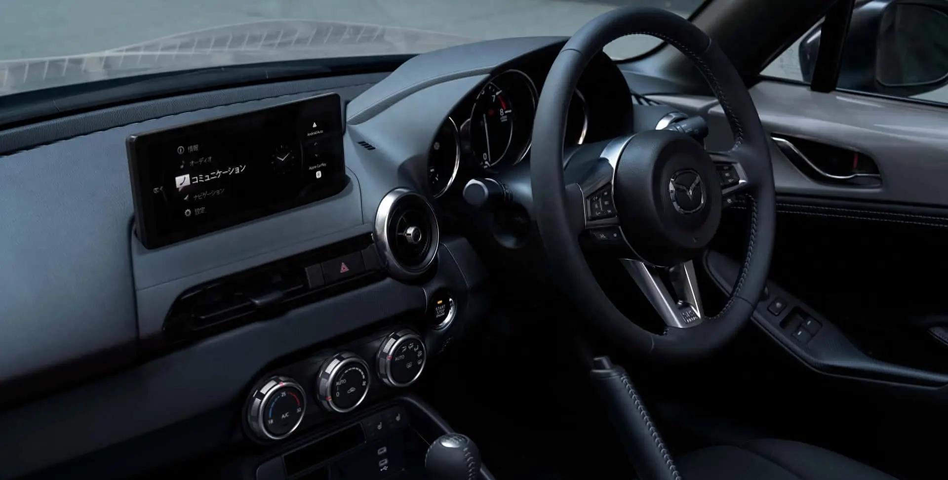 内饰方面,新款MX-5配备了一块8.8英寸的中控屏幕,搭载了最新的车载系统。内饰颜色方面,采用了褐色搭配米色车顶。此外,新款MX-5还对转向系统进行了改良,提供更真实的路感反馈。