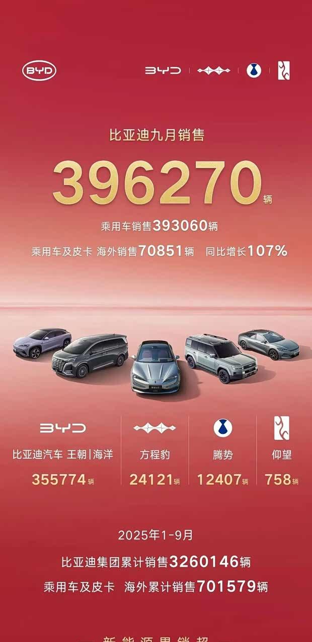 在业务拓展的同时,比亚迪近期公布了9月销售数据。该月总销量达396270辆,其中乘用车销售393060辆。海外市场表现突出,乘用车及皮卡出口70851辆,实现107%的同比增长。今年1-9月累计销量达3260146辆,同比增长18.64%。