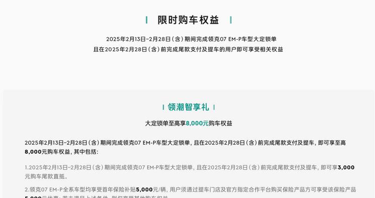 近日,领克官方宣布对07 EM-P车型进行价格调整,调整后的售价区间为15.98万元至17.98万元。此次调整涉及三款车型,为消费者提供了更具吸引力的购车选择。同时,官方还推出了限时购车权益,从2月13日至2月28日期间,完成大定锁单的消费者可享受8000元购车权益、最高8000元选装基金、5年0息金融方案以及最高6000元置换补贴等优惠。目前,该车的限时起售价为15.18万元。