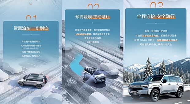 升级后,车辆的智慧泊车功能得到增强,支持用户收藏常用停车区域。即便在车位线被大雪覆盖的情况下,系统仍可在距离目标车位约30米范围内进行识别与匹配。同时,新增的eAES防夹心功能能够在低附着力路面辅助车辆完成自主变道。