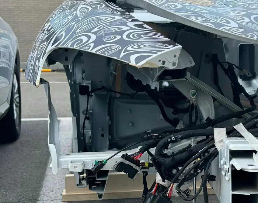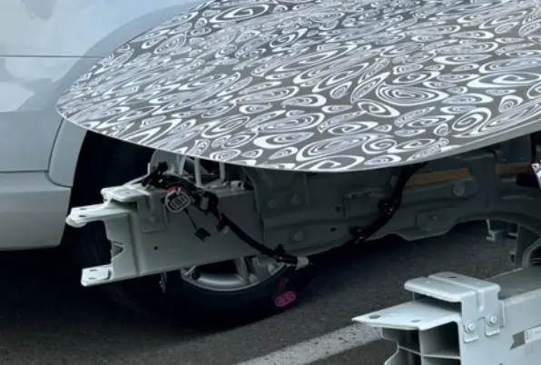在另一张图中,我们可以看到前轮宽大的轮拱位置,整体呈现出非常明显高轮拱样式。而细节之中还能看到其内部添加了加强结构,这或许是为了提高乘员舱25%偏置碰撞的抵御能力。