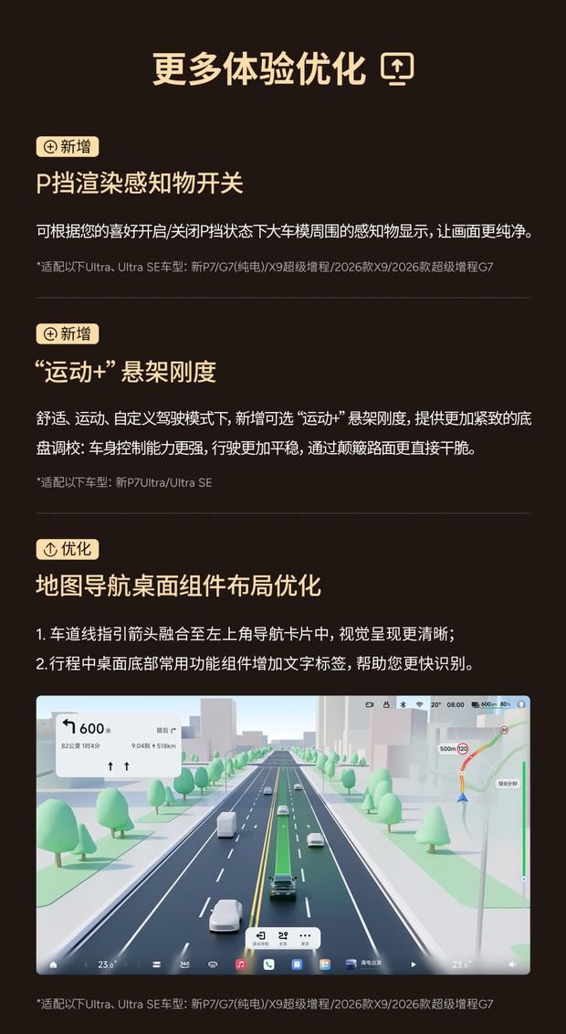 本次系统更新覆盖了多款主力车型,包括2026款小鹏P7+、G9、G6的Ultra及Ultra SE版本,以及G7超级增程版等。全国范围内的小鹏门店均已同步提供相应的升级服务。