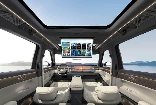 内饰部分,新车采用一体环抱式座舱布局,中控台配备双15.6英寸联屏,后排则设有21.4英寸吸顶娱乐屏。车内采用6座设计,并搭载总长度达12.8米的氛围灯系统。在智能驾驶方面,车辆所配备的辅助系统可实现高速、城市及点到点导航辅助驾驶,支持无图化全场景覆盖。