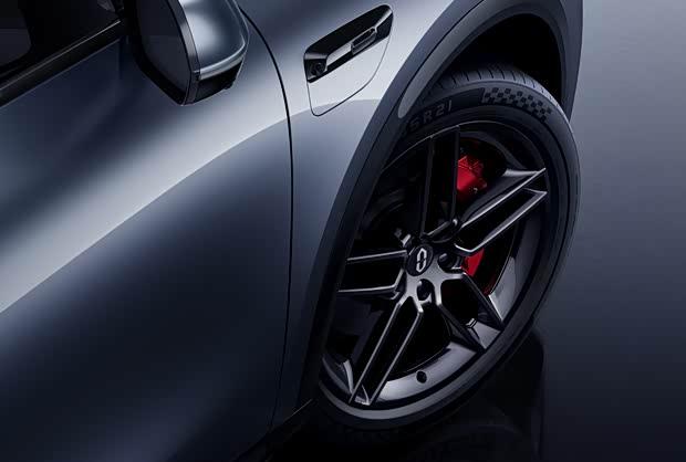 车身侧面线条流畅,配备半隐藏式门把手、黑色轮眉与双五辐轮圈,红色制动卡钳进一步强化运动感。车顶搭载激光雷达及后向固态激光雷达,科技配置显著。尺寸方面,其长宽高分别为4960/1985/1736毫米,轴距达到2950毫米,并提供20英寸与21英寸两种轮圈规格。