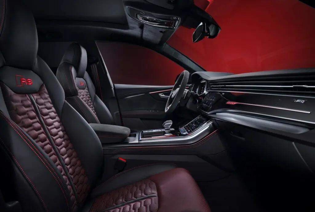 在内饰方面,新款RS Q8提供红色、灰色、蓝色三种RS内饰套件,包括Alcantara材质包覆的方向盘、Dinamica材质的中控台和一体式运动座椅。此外,新车配备全液晶仪表盘、中控屏以及副仪表台控制屏。