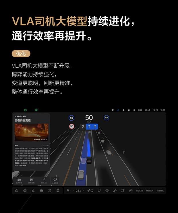 本次升级中,VLA司机大模型进一步强化,新增路口车速与车道记忆能力。用户可通过语音指令设定特定路口的行驶车速与车道选择,例如指示“前方路口以后都开30”或“前方路口以后都走最右侧车道”。同时,该模型在变道逻辑上也进行了优化,表现更为智能。