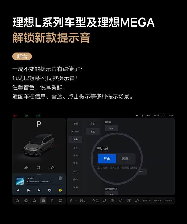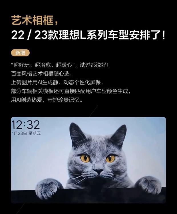 音响体验方面,理想MEGA与理想L系列车型将获得新款提示音。而对于理想MEGA与理想i系列纯电动车型,用户可通过官方应用程序远程开启充电预冷预热功能。2022款与2023款理想L系列车型则新增艺术相框功能。