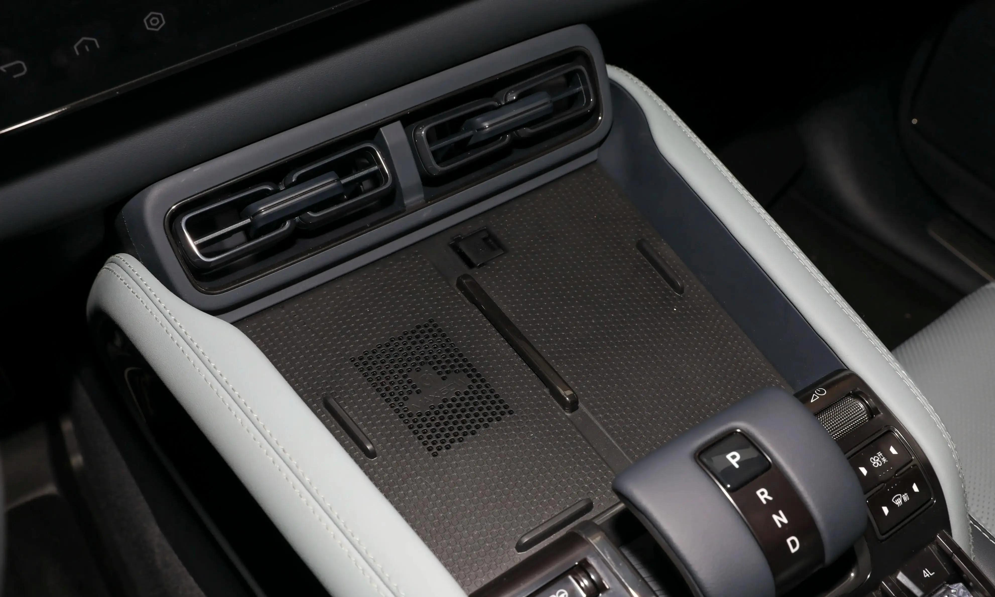 豹5车内融入了“超级锁扣”设计理念,与外部细节呼应。换挡杆采用可升降式设计,车辆启动时会升起,熄火时会缓慢回落。副仪表台采用了双层设计,上层设有50瓦手机无线充电口,并在右侧预留了穿线口;下方是储物空间和香氛、USB接口。