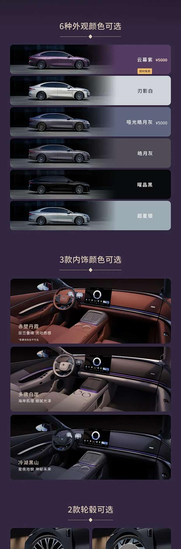 外观方面,昊铂A800提供六种车身颜色,包括云暮紫、刃影白、哑光皓月灰、皓月灰、曜晶黑和超星银。其中云暮紫与哑光皓月灰需额外支付5000元选装,盲订期间云暮紫可限时免费选择。内饰则提供赤壁丹霞、多佛白崖及冷湖黑山三种配色,值得注意的是,智慧领先型无法选装赤壁丹霞内饰。轮圈方面,用户可在20英寸12条幅涡式与20英寸7孔碟式两种设计中任选其一,后者配备悬浮轮毂标识。