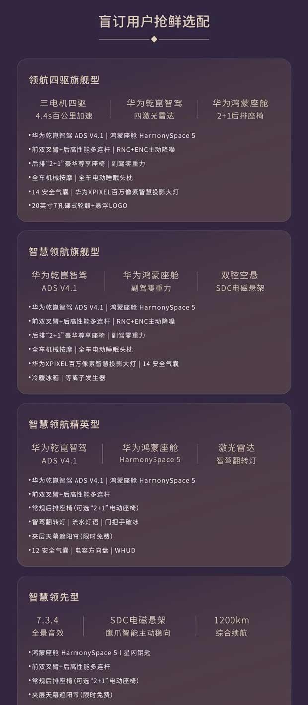 智慧领航旗舰型则进一步升级,标配副驾零重力座椅、双腔空悬与SDC电磁悬架组合、RNC+ENC主动降噪、后排“2+1”豪华尊享座椅、全车机械按摩、全车电动睡眠头枕、华为XPIXEL百万像素智慧投影大灯、14安全气囊、冷暖冰箱以及等离子发生器等高端配置。
