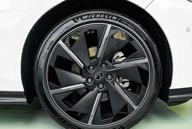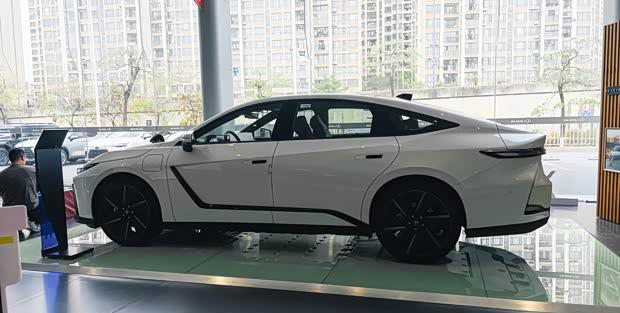 车身侧面保留了经典的三厢轿车结构,车顶线条略带溜背造型。上扬的腰线与车门处的黑色饰条交汇,配合紧凑的车身比例,令整车显得更为修长。细节方面,充电口位于前翼子板处,车门把手采用半隐藏式设计,并配备21英寸轮圈,轮胎规格为235/45 R21。