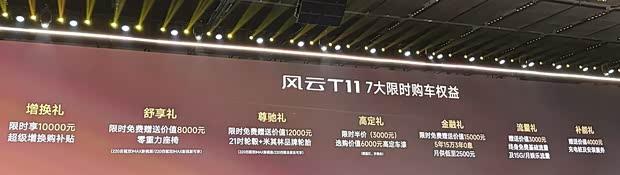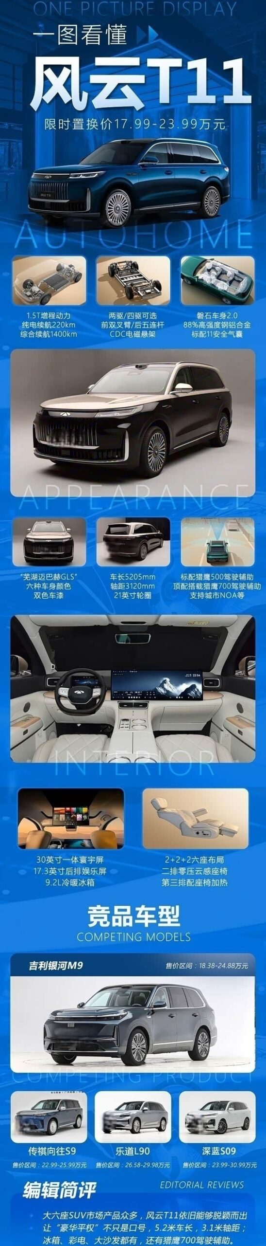 奇瑞风云T11于10月30日正式推向市场,共推出4款配置车型,官方指导价格区间为18.99万元至24.99万元。同时推出限时置换政策,置换后价格区间为17.99万元至23.99万元。作为风云品牌旗舰SUV,新车定位6座大型增程式SUV,CLTC工况下纯电续航达220公里,综合续航里程可达1400公里。
