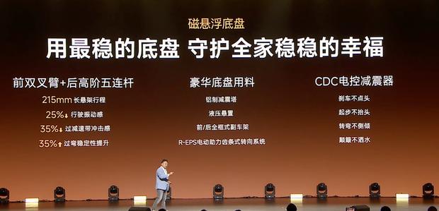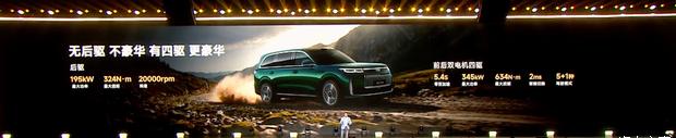 动力系统搭载1.5T混动专用发动机,热效率达45.79%。两驱版采用后置电机,最大功率195kW;四驱版前后双电机综合功率345kW,百公里加速5.4秒。WLTC馈电油耗最低6.1L/100km,支持15分钟快充。底盘采用前双叉臂后五连杆悬架,配备CDC电控减振器与智能四驱系统。
