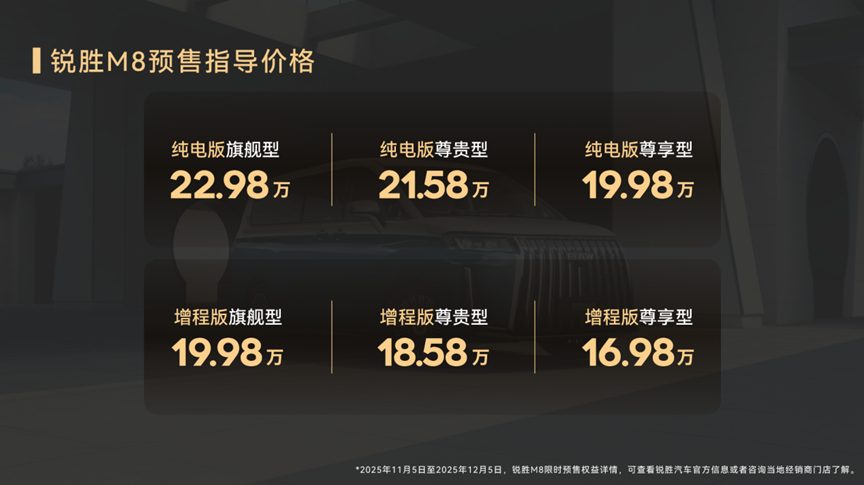 ​11月5日,北京汽车制造厂旗下专注MPV赛道的独立品牌锐胜汽车在青岛举行"全场景·才是真舒享"预售发布会。锐胜M8大型MPV正式开启预售,其中增程版预售价格16.98万元起,EV版19.98万元起。新车以"三排都是商务舱"的奢适体验,为大型MPV市场带来高质价比新选择。​