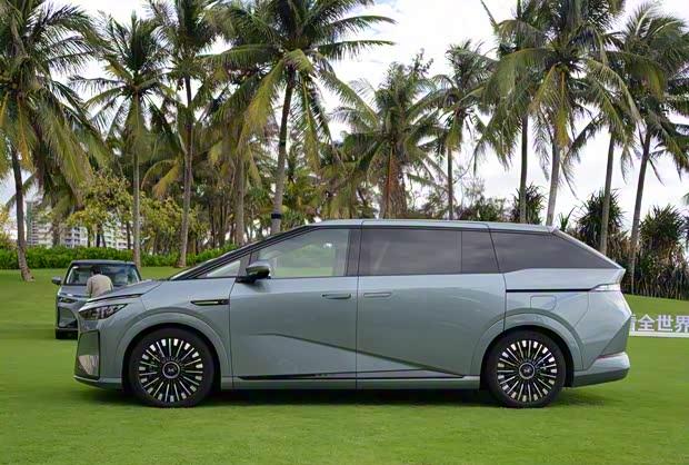 车身侧面通过隐藏式立柱设计形成悬浮式车顶效果,外扩轮眉搭配20英寸密条辐轮圈强化整车力量感。新车长宽高保持5316×1988×1785mm,轴距达3160mm,车身长度较纯电版有所增加。尾部采用大面积无边界后窗玻璃与快背线条设计,为这款大型MPV注入运动气息。提供六种车身颜色选择,包括暗夜黑、星云白等配色方案。