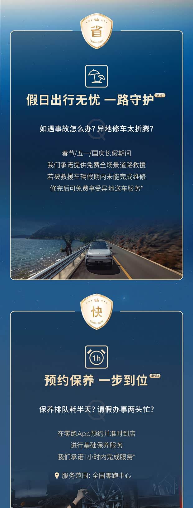 针对法定长假期间可能出现的出行救援需求,零跑汽车承诺在春节、五一、国庆等假期提供免费全场景道路救援。服务范围包括将无法行驶的车辆拖至最近的服务中心,具体实施方式将根据实际情况沟通确定。若车辆在假期内未能修复,用户还可享受免费跨省辖市的异地送车服务,但需满足因假期救援进店且节前未修复的条件。