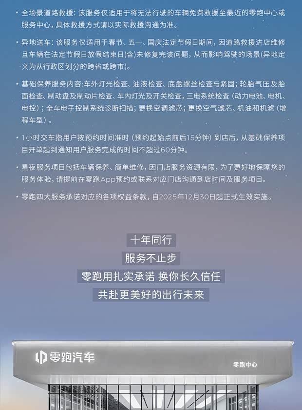 零跑汽车于12月30日正式推出四项服务承诺,旨在优化用户在车辆维保过程中的体验。新权益覆盖救援、保养、信息透明及服务时间等关键环节,并于发布之日起生效。