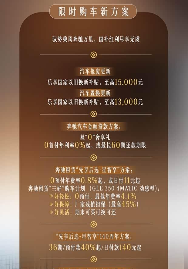 梅赛德斯-奔驰GLE系列近日推出限时购车方案,多项金融政策与配置升级同步实施。