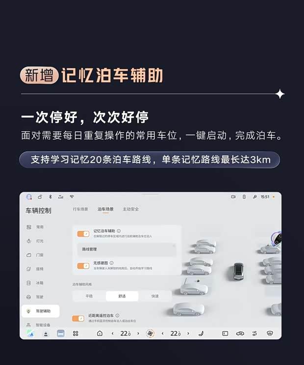本次系统升级中,城市记忆领航辅助驾驶功能可支持用户预设10条常用行驶路线,每条路线最长记录里程达100公里。记忆泊车辅助功能则能记录20条泊车路径,单条路径最大记忆距离为3公里。