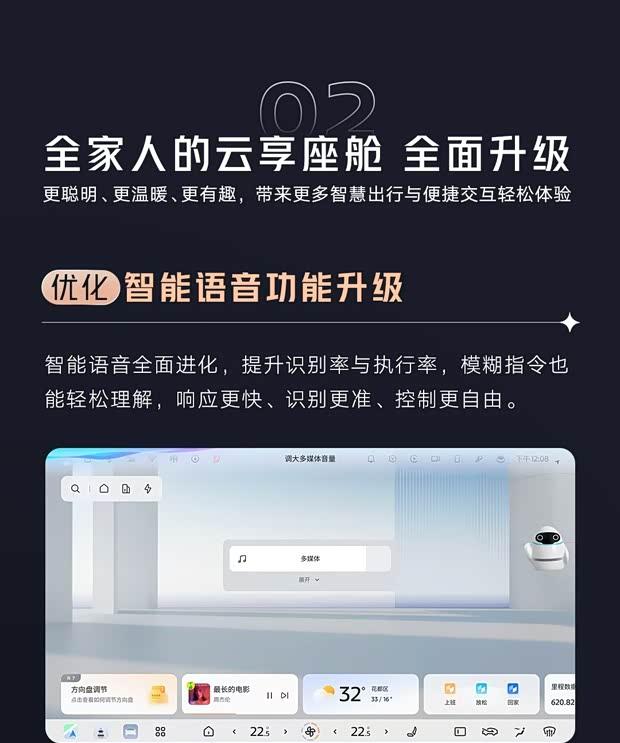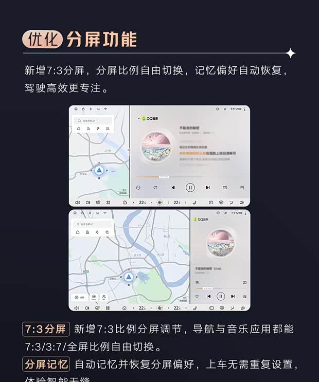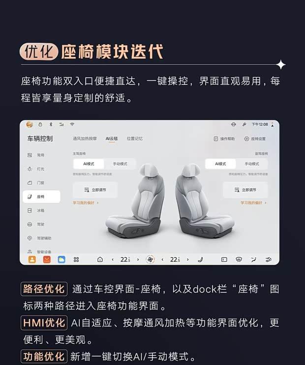 除上述新增功能外,此次升级还涉及多项智能座舱体验的提升。系统对语音交互功能进行了优化改进,座椅控制模块完成版本迭代,新增了魔法画布灯光主题,并对分屏显示功能进行了完善。