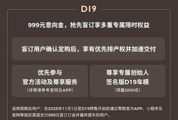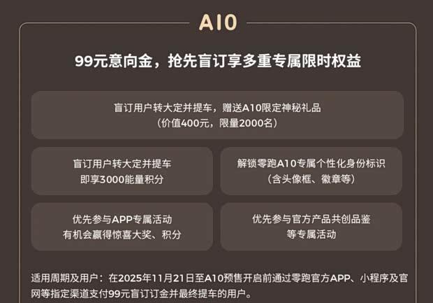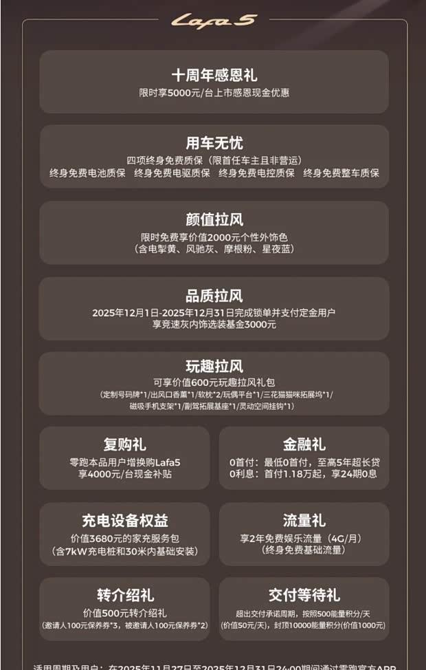 具体来看,Lafa5可享5000元现金优惠,个性外饰颜色免费选装,同时提供0首付或0利息金融方案,零跑老用户增换购还可额外获得4000元补贴。A10车型在盲订转大定后,将赠送400元限定礼品及3000能量积分;D19的前2000名购车用户可获得签名版车模。
